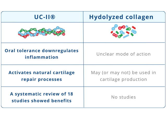 Thanks to this patented process, UC-II® has a mode of action different from other supplements, including hydrolyzed collagen.