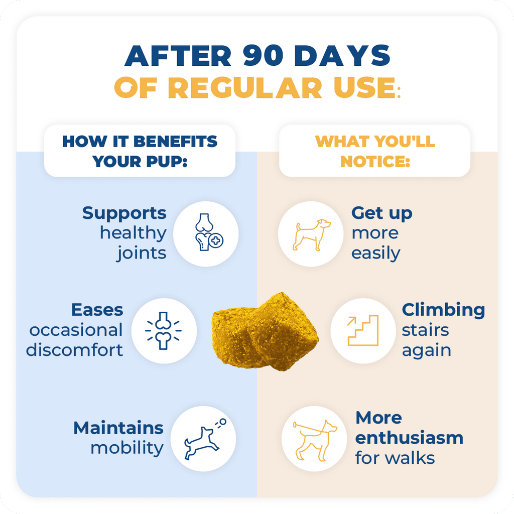 We recommend checking with your veterinarian if your dog shows symptoms like sadness, dullness, unwillingness to play or go out, stiffness after lying down, difficulty climbing stairs or getting on the sofa or into the car, lameness, or other mobility issues. Our Jope Hip & Joint Dog Chews can help improve your dog's joint health and mobility.